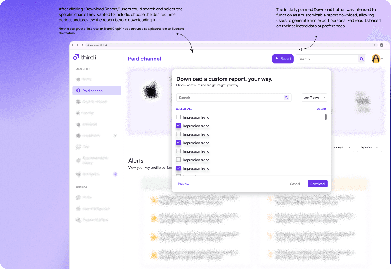 At Thirdi, we noticed that users often struggled to create and customize reports from multiple ad platforms. The old flow required exporting raw data into spreadsheets or relying on pre-set templates that lacked flexibility.