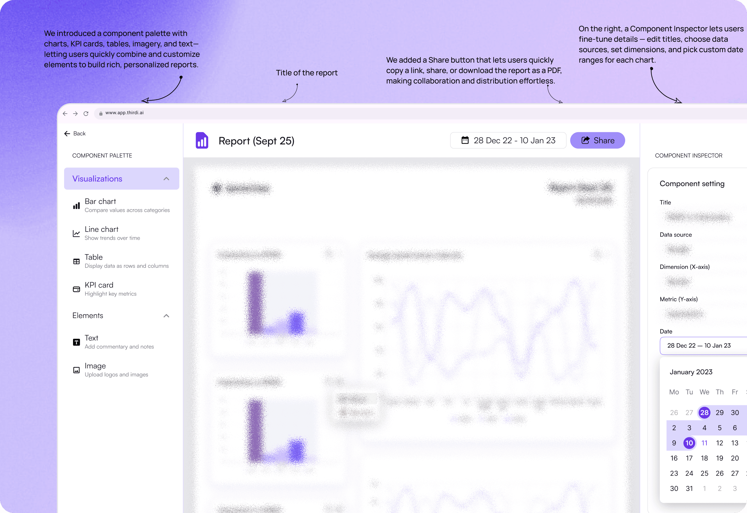 This small thought sparked discussions and user feedback sessions. Quickly, we realised that limiting customisation to just the download flow wasn’t enough.It evolved into the concept of a standalone “Report Builder” page — a dedicated space where users could drag, drop, and configure charts, text, and branding before exporting.